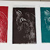 Her kan man se en av lino knivene og at jeg har skjært bort det som skal bli hvitt. Det som skulle bli sort skulle ikke skjæres, og for å få gråtoner måtte vi skjære linjer. Det har jeg gjort i halve ansiktet.